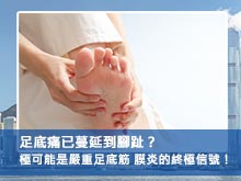 現今許多都市人都受腳部疾患困擾,臨床的常見病及多發病如足底筋膜炎就是導致足跟痛的主要原因。足底筋膜炎是指足底筋膜和周圍的.......
